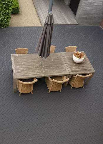 Het visgraatpatroon zorgt niet alleen voor een luxueuze uitstraling, maar ook voor extra stabiliteit. Perfect voor opritten en intensief gebruikte buitenruimtes.